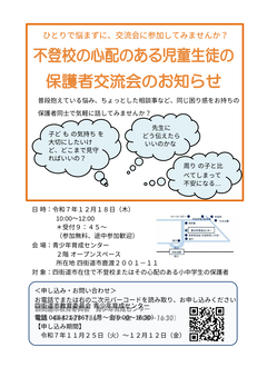 不登校の心配のある児童生徒の保護者交流会を開催いたします。