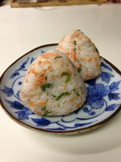- ごはんに鮭フレーク、千切りにした大葉、白炒りごまを混ぜる。