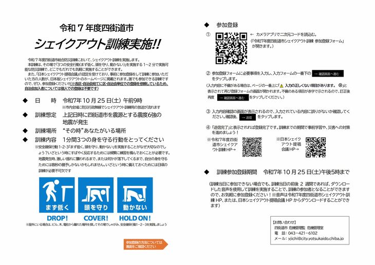 【終了しました】令和7年度四街道市シェイクアウト訓練参加者募集
