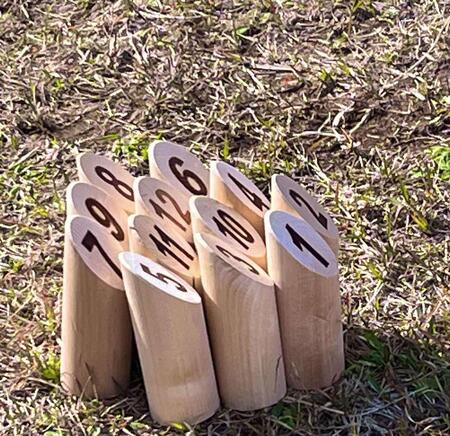 専用の木の棒を投げて、倒れたピンの数やピンに書かれた数字を計算してチームの勝敗が決まります。