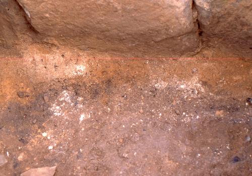 長方形の墓坑の中に石棺を組み入れ、墓坑と石棺の間は白色粘土や褐色土などで埋めていました。また、底面には石ではなく木炭が厚さ二センチほど敷かれており、あまり類例のない手法を使っていました。