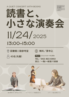 11月24日(月曜・休)に四街道市立図書館で「読書と、小さな演奏会」を開催します。読む人の時間に、音楽がそっと寄り添う特別なひとときを過ごしませんか。